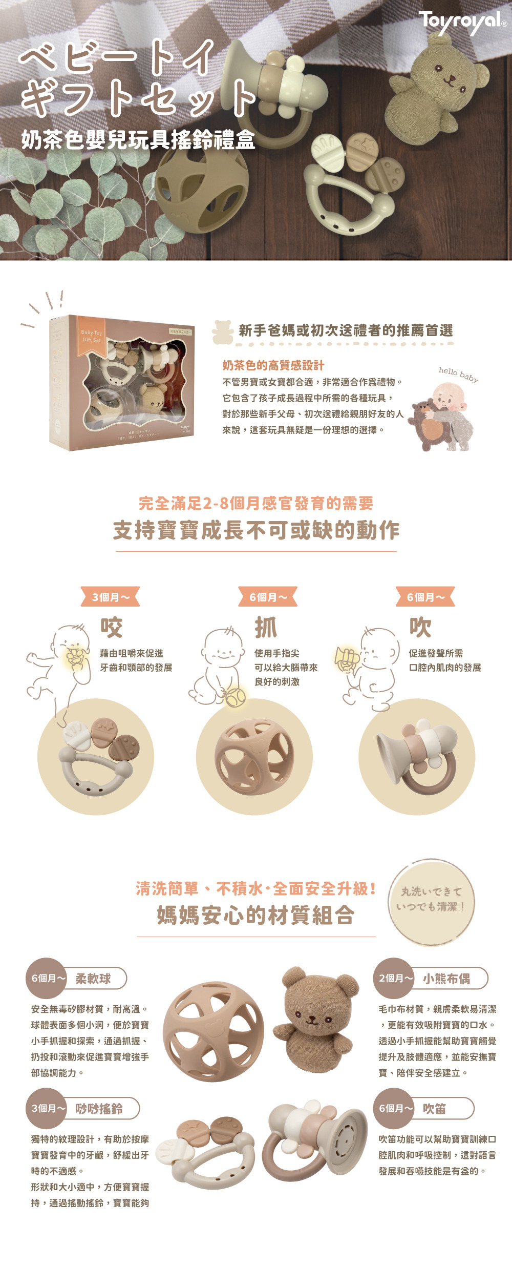 ① 滿足2-8個月嬰兒感官發育需求,包含「咬」「抓」「吹」
